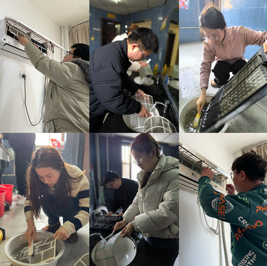 活動(dòng)期間,大家分工協(xié)作、互相配合。志愿者先對(duì)空調(diào)進(jìn)行斷電,打開空調(diào)蓋板,取出空調(diào)濾網(wǎng),接著使用抹布和清洗劑對(duì)空調(diào)外機(jī)、濾網(wǎng)等部件進(jìn)行全面細(xì)致的清洗。