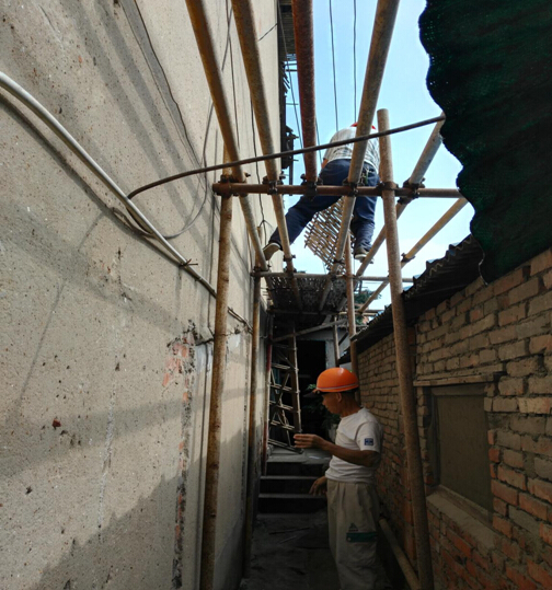 近日,公司后勤綜合服務部在對公司老舊房屋進行日常巡查時發現,原四分公司生活基地大禮堂山墻檐口出現間斷式沉降斷裂。經檢查,此處的問題是由墻體自重及屋面木質結構自然腐朽所導致的。山墻腳即是住戶出入通道,隨時有墜落傷人的安全隱患。鑒于大禮堂層高十幾米,無法實施維修處理,我部第一時間向領導匯報后,及時拿出整頓方案,頂著烈日高溫,立即沿山墻搭建一條十幾米長的鋼管架安全通道,排除了隱患,確保居民出入平安。
